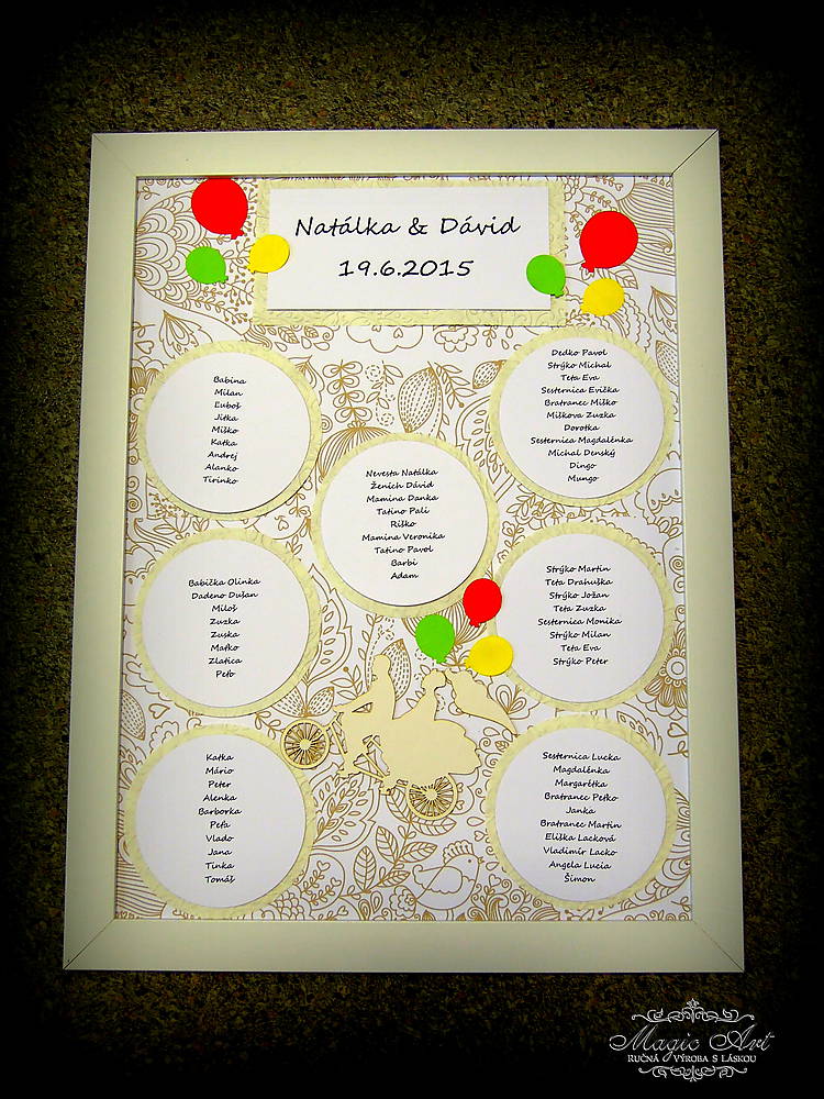 Ak chcete menovky úplne vynechať, použite zasadací poriadok. Vsetky tlacoviny (oznamenia, pozvanky k stolu, etikety na svadobne vino, svadobne menu a zasadaci poriadok) spolu vytvorili krasnu harmoniu a dotvorili.